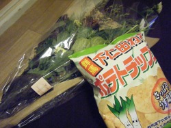 (下仁田ねぎポテトチップス・ばかうけ(ねぎ味噌風味)・茨城名物なっとう味スナック→これは友達の好物)