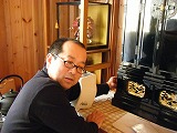 1st終了後、控え室にて仏壇の前に置いてあったデジタル自動血圧計でを血圧を測定中の斉藤さん。